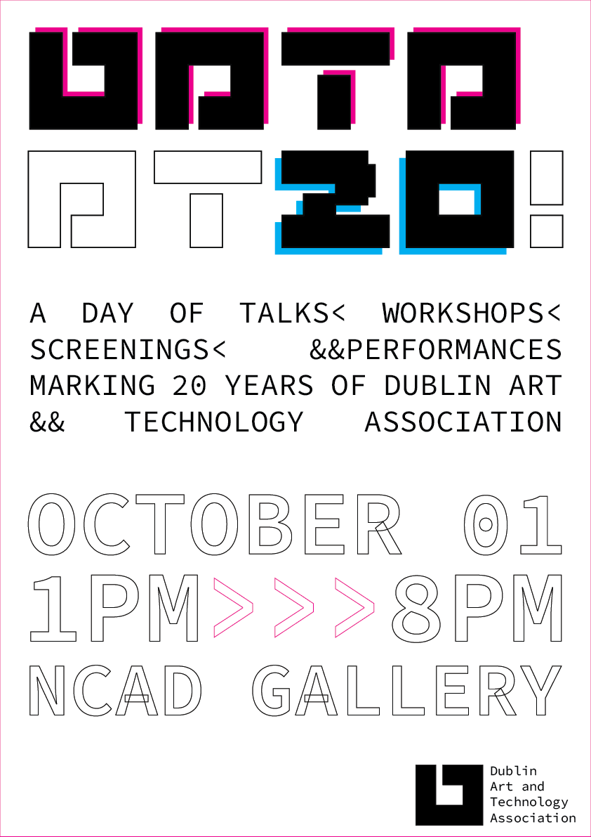 2022 marks the 20th Anniversary of Dublin Art and Technology Association (D.A.T.A) - a Dublin based platform for artists, makers and thinkers to share knowledge about digital cultures and practices. To celebrate, D.A.T.A, in association with NCAD Gallery, is hosting an event on Saturday 1st October 2022, 1PM-8PM, that includes a series of talks, workshops, screenings and performances from past D.A.T.A participants. The series will look at the work of former DATA presenters since their time presenting as part of D.A.T.A. All Events are free. All are welcome to attend.